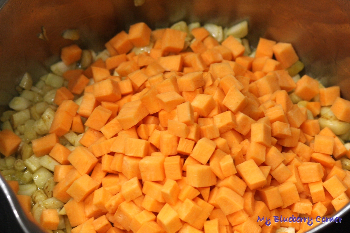 W garnku roztopić masło, dodać pietruszkę, po chwili bataty. Prażyć warzywa (co jakiś czas mieszając) przez 20 minut.