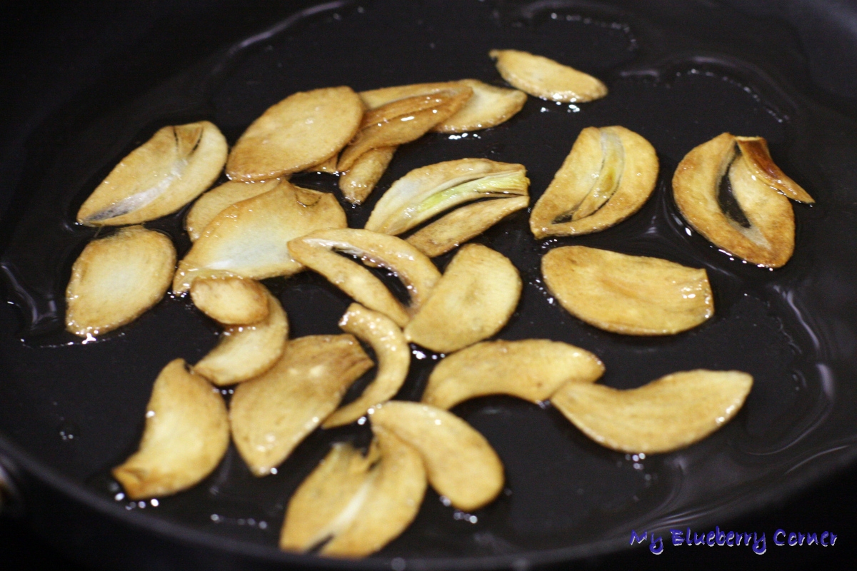 Na patelni rozgrzać oliwę, wrzucić plasterki czosnku, delikatnie posolić. Smażyć do czasu aż powstaną rumiane, chrupiące chipsy.