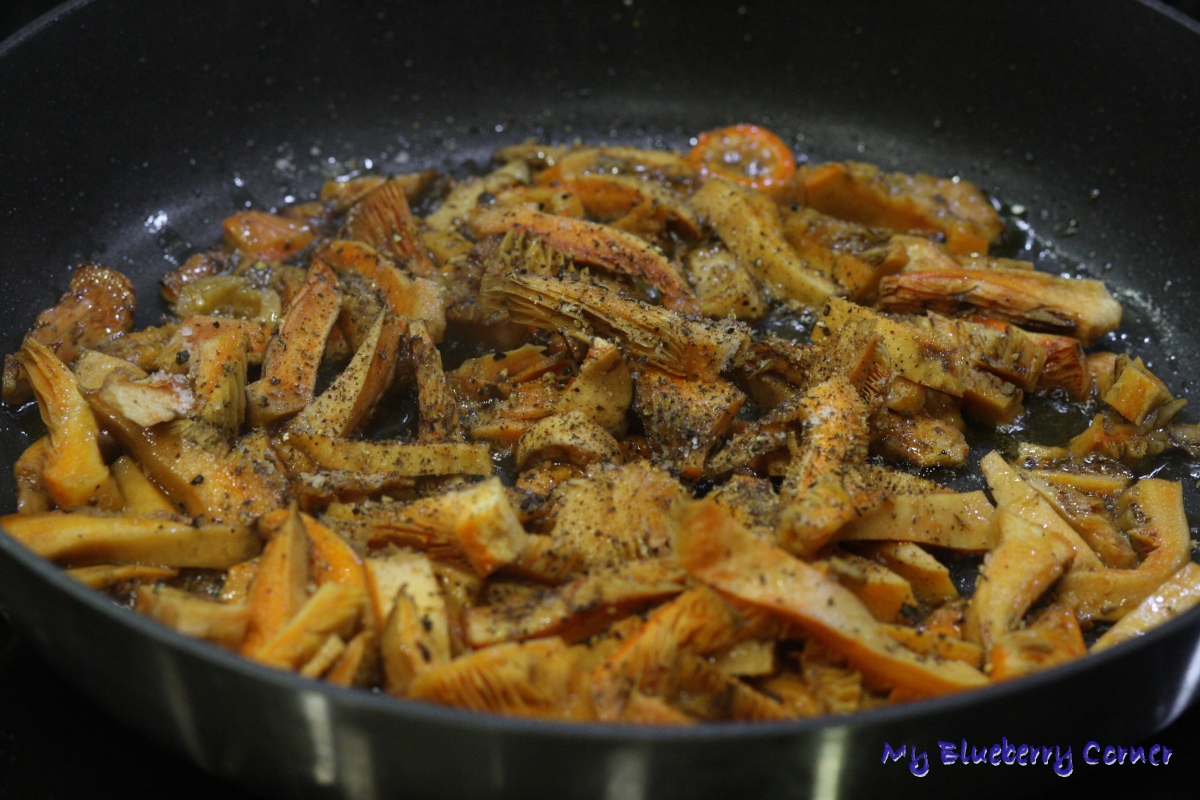 Na patelni rozgrzać 3-4 łyżki oleju, wrzucić grzyby. Doprawić solą, pieprzem. Smażyć do czasu, aż nadmiar płynu odparuje a rydze zmiękną.