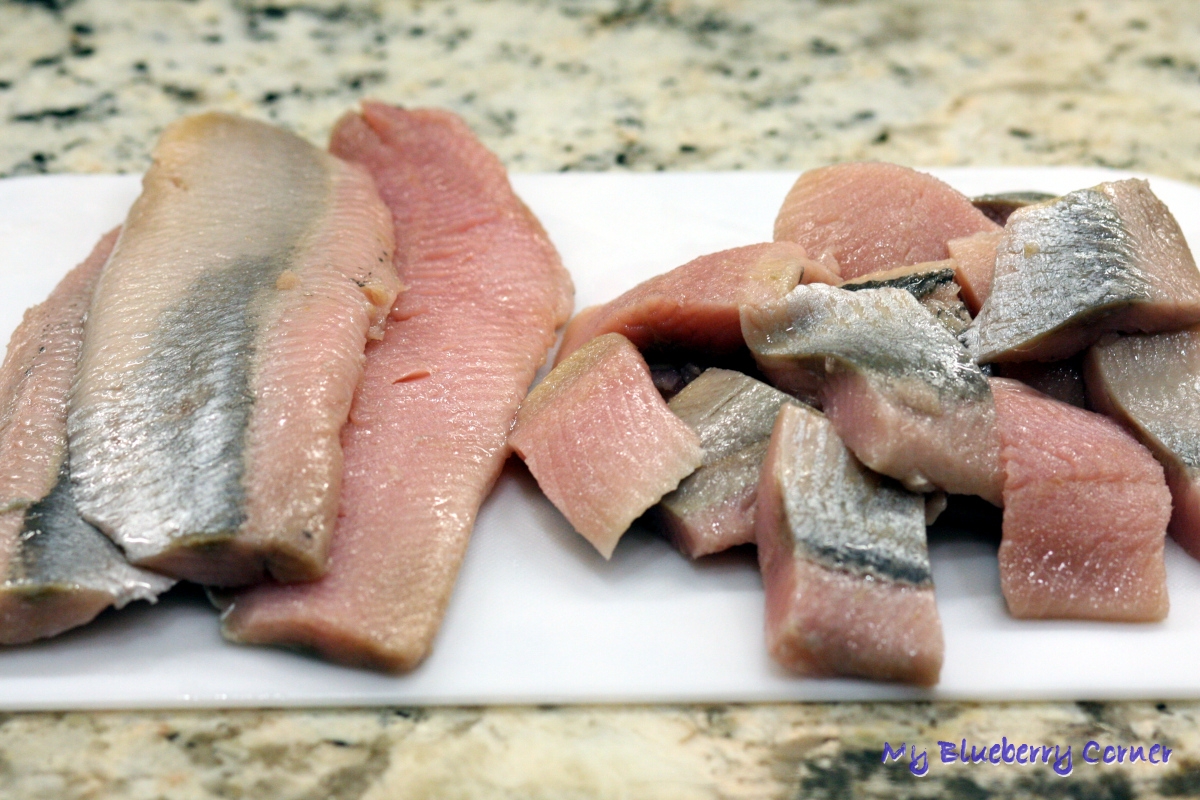 Śledzie pokroić na dzwonka.