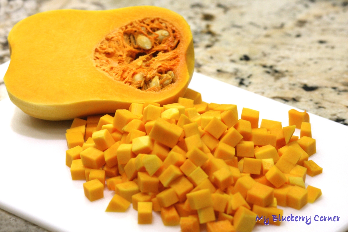 Dynię obrać, oczyścić z gniazda nasiennego, pokroić w niedużą kostkę.
