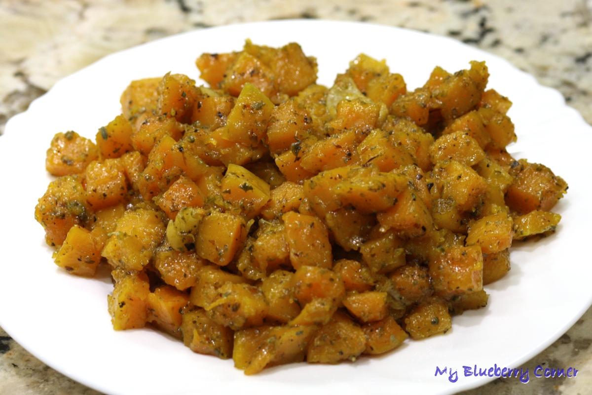 Ząbki czosnku obrać, rozgnieść. W żeliwnym garnku rozpuścić łyżkę miodu. Wrzucić pokrojoną dynię, zamieszać, dodać czosnek. Wszystko razem podsmażyć. Po chwili dodać masło, Przyprawić solą, pieprzem, płatkami chili i majerankiem, przełożyć na talerz.
