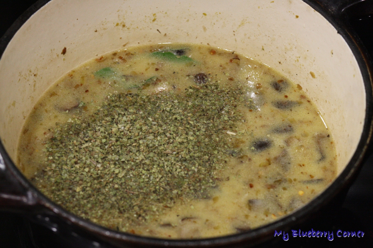 Wlać napój owsiany, wrzucić ziele angielskie, liście laurowe. Posolić, doprawić pieprzem i chili w płatkach, dodać majeranek i płatki owsiane.