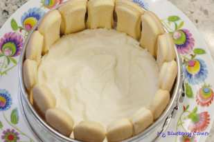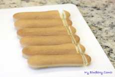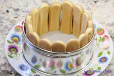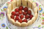 Śmietana i ser mascarpone muszą być porządnie schłodzone, najlepiej prosto z lodówki. Obręcz od małej tortownicy (ø 16cm) umieścić na talerzu lub paterze. Biszkopty przyciąć z jednej strony, wyłożyć nimi brzeg rantu tortownicy.