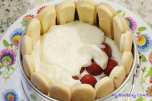 Na dno obręczy z biszkoptami wyłożyć kilka łyżek masy, ułożyć truskawki i przykryć je pozostałą częścią śmietanowo-serowej masy.